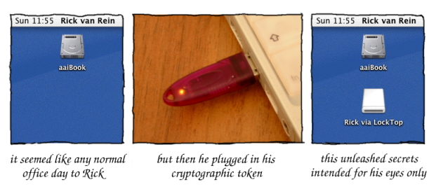 Hard disks contain information that is too senstitive to fall in the wrong hands. Protecting such information is possible with disk encryption. The LockTop tokens are a straightforward manner of maintaining the privacy of such information: plug it in to access the information, remove it to secure the data.